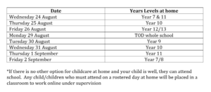 We are going to move for the next 2 weeks into a hybrid model of learning that combines time ‘in school’ with time ‘learning from home’. We want to minimise disruption to any one group of students as much as we can, so will be rostering home for year-level groups for a day at a time.