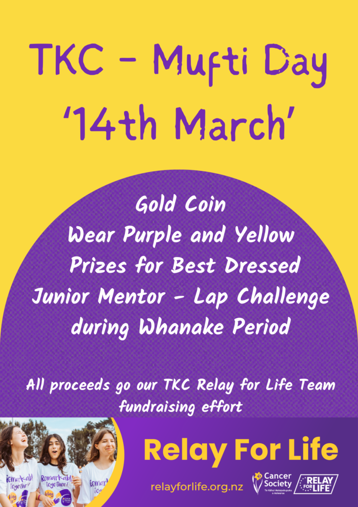 Please bring a gold coin for our Relay for Life mufti day – Thursday, March 14. We would love to see students in purple and yellow. Best dressed will win a prize. Please support this wonderful cause as we do our part to help support those, and their whaanau, who are fighting cancer.